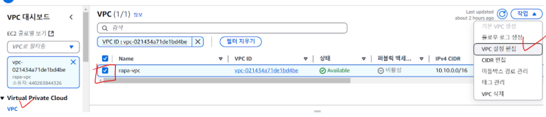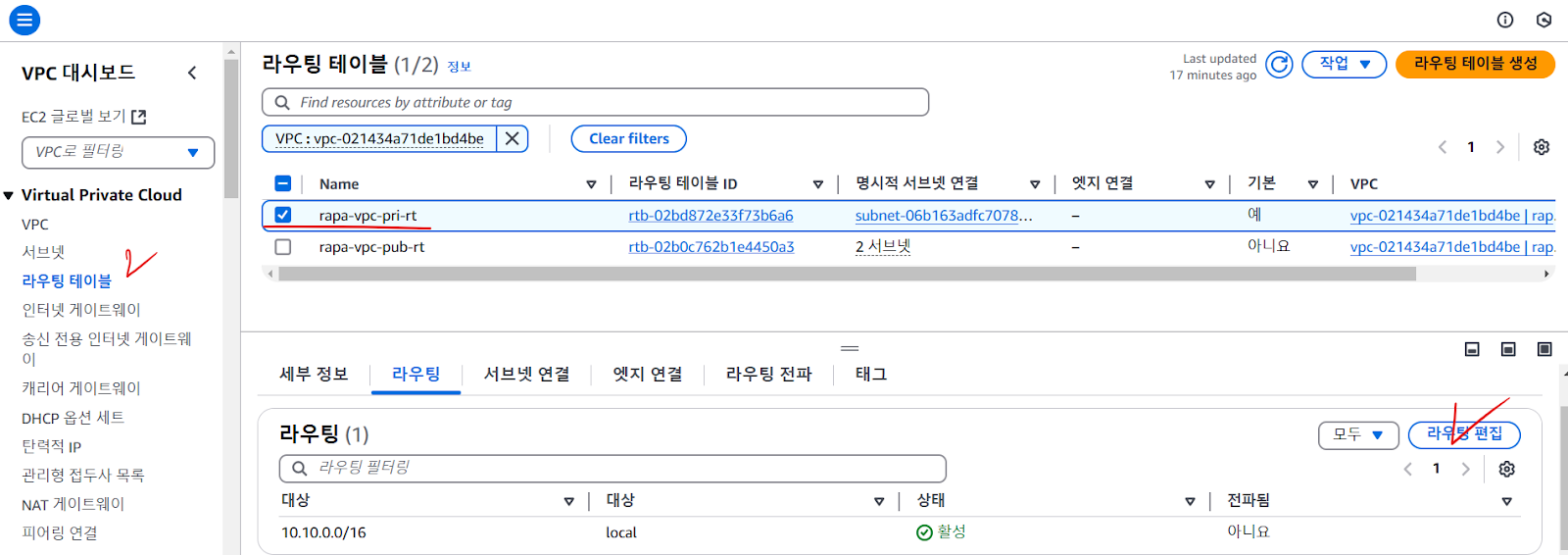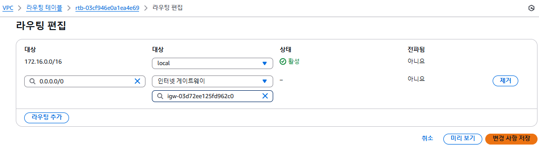 - 서브넷을 만들면 이 라우팅테이블이 자동으로 선택되니까(비명시적,따로 라우팅테이블을 지정안하면) 이 기본라우팅테이블을 프라이빗서브넷을 위한 라우팅테이블로 이름을 붙여주자.