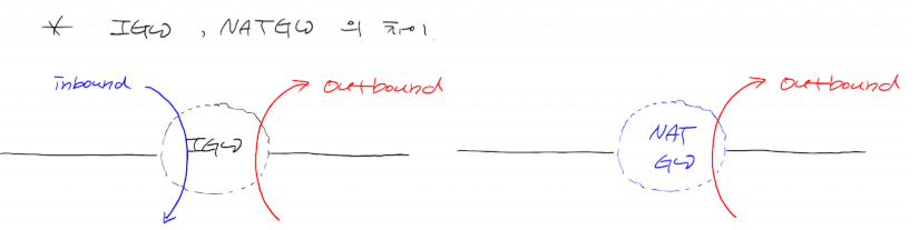 # 사실 VPC에 존재하는 자원들이 통신이 되냐 안되냐의 차이는 기본적으로 공인아이피가 있냐 없냐로 볼 수 있음. 공인아이피를 달고있는 서버가 IGW를 next-hop으로 라우팅이 되어있다면(=퍼블릭서브넷에 있다면) 인바운드, 아웃바운드 다 된다. 마찬가지로 프라이빗 서브넷에 존재하는 서버가 외부로 통신이 안되는 이유는 공인아이피도 없고 라우팅도 안되어있기때문이다. 따라서 아웃바운드라도 가능하게 하기위해서 NAT-GW에 EIP를 붙여서 PAT를 해준다고 생각하면 좋다.