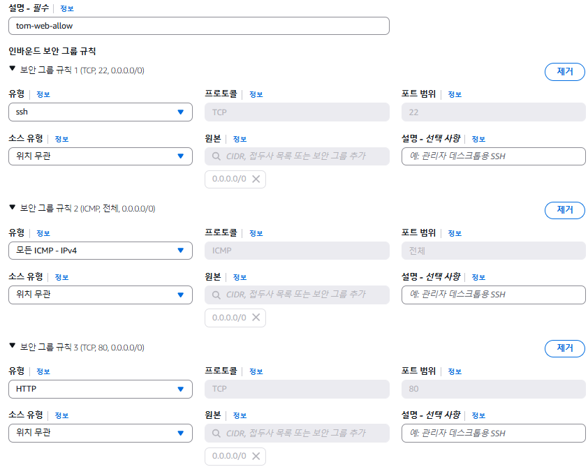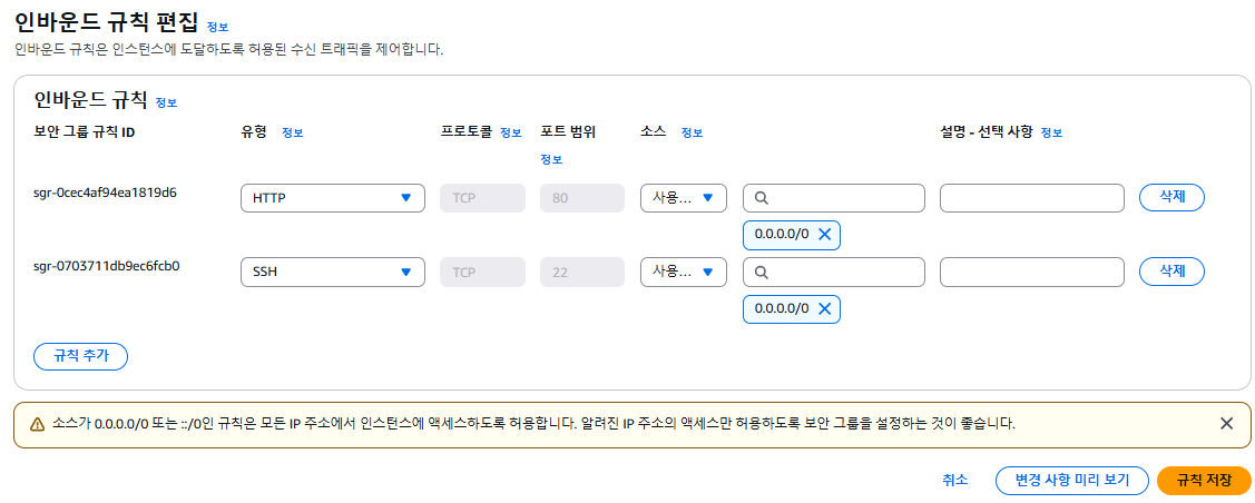 근데 80으로 설정해줘야됨 잘못 설정함. 수정해주고 싶을 때는 보안 그룹 클릭